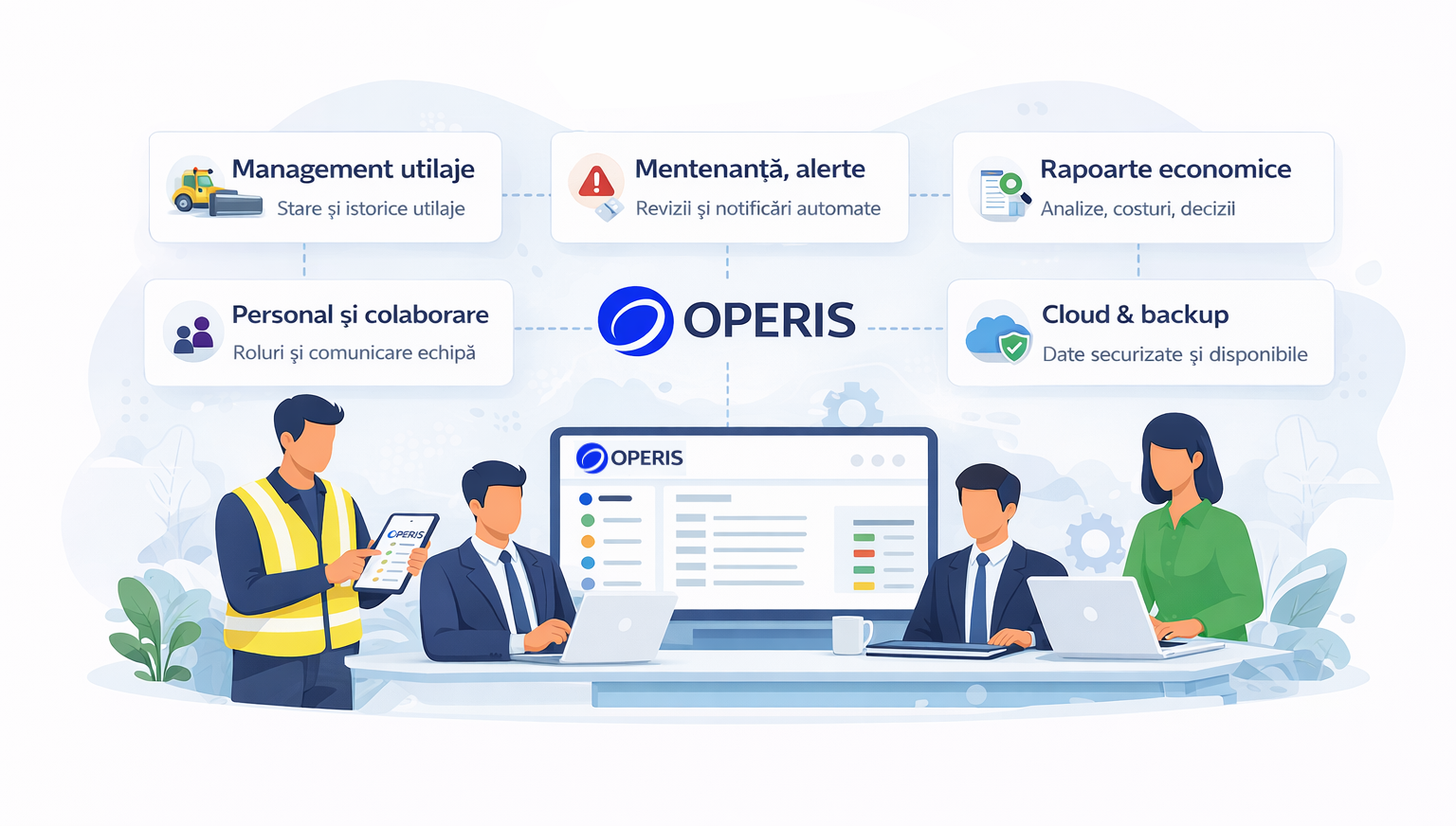 OPERIS Cloud centralizează utilaje, personal, activități, mentenanță, documente, alerte, rapoarte și zona economică. Lucrezi mai rapid, reduci omisiunile și ai vizibilitate reală asupra operațiunilor zilnice.
